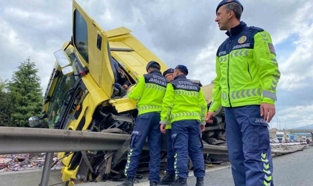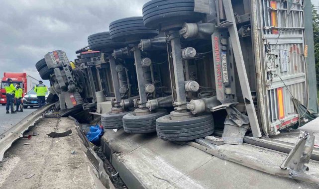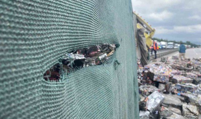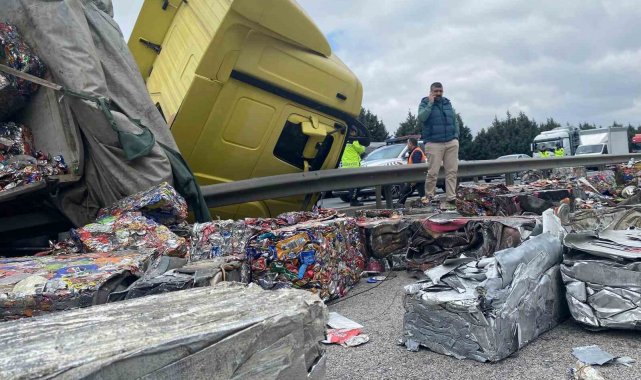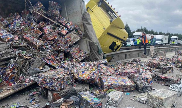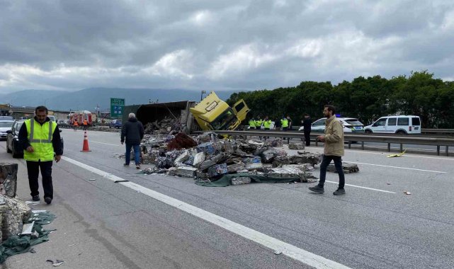 TEM Otoyolu'nun Kocaeli geçişinde hurda yüklü tır, demir bariyere çarptıktan sonra sürüklenerek yan yattı. Kazada tırda yüklü hurdalar yola saçılarak, trafiği olumsuz etkiledi.