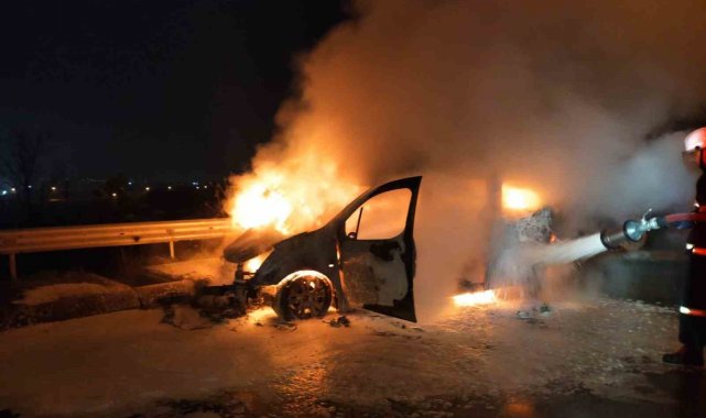 TEM otoyolunda seyir halinde olan hafif ticari araç alevlere teslim oldu. Alev alev yanan araç itfaiye ekipleri tarafından söndürülmesinin ardından geriye demir yığını kaldı.