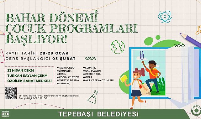 Tepebaşı Belediyesi Çocuk Sanat ve Kültür Merkezleri ile Özdilek Sanat Merkezi'nde ücretsiz olarak düzenlenecek çocuk programları bahar dönemi kayıtları 28 Ocak'ta başlıyor. 23 Nisan Çocuk Sanat ve Kültür Merkezi, Türkan Saylan Çocuk Sanat ve Kültür Merkezi ile Özdilek Sanat Merkezi'nde düzenlenecek 11 farklı branştaki kursların kayıtları online gerçekleştiriliyor. Birçok yaş grubundan çocuğa hitap eden programlar arasında tekvando, jimnastik, resim, çocuk atletizm, drama, satranç, seramik, cam füzyon, çocuk yoga, gitar ile akıl ve zeka oyunları yer alıyor.