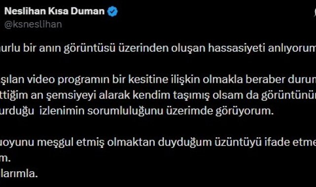 Tepkiler üzerine yazılı açıklama yapan Duman, görüntülerin yağmurlu bir ana ait olduğunu belirterek, "Yağmurlu bir anın görüntüsü üzerinden oluşan hassasiyeti anlıyorum. Paylaşılan video programın bir kesitine ilişkin olmakla beraber durumu fark ettiğim an şemsiyeyi alarak kendim taşımış olsam da görüntünün oluşturduğu izlenimin sorumluluğunu üzerimde görüyorum. Kamuoyunu meşgul etmiş olmaktan duyduğum üzüntüyü ifade etmek isterim" ifadelerini kullandı.