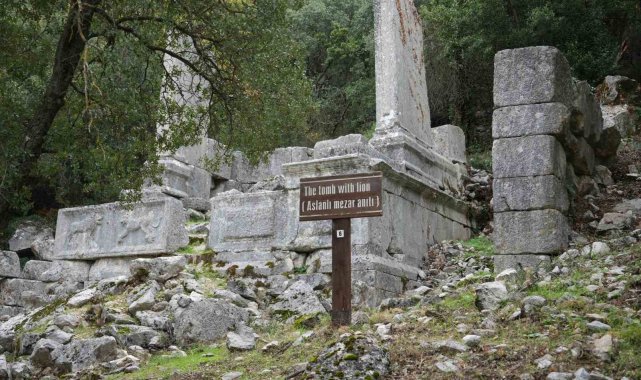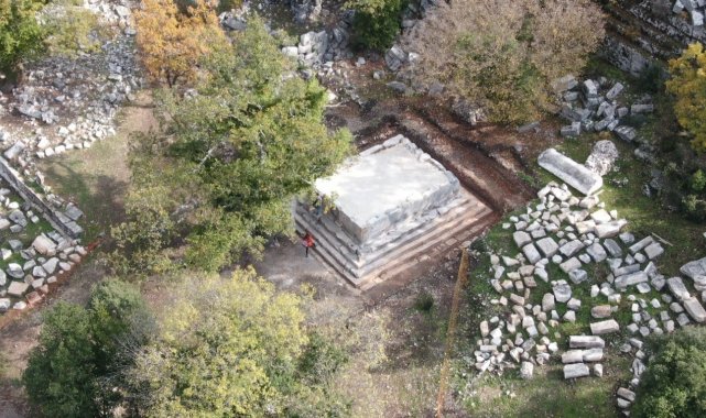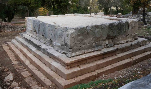 Kazı sezonunun bir diğer önemli çalışması, çevresine dağılmış yüzlerce mimari bloğun arasında yer alan anıt mezar podyumunun ayağa kaldırılması oldu. Koçak, yapının sahibinin yazıtlardan bilindiğini belirterek, "Bu mezar Antiochis adında bir kadın tarafından kendisi, eşi ve eşinin kardeşi için yaptırılmış. Podyumun dört yanında silah kabartmaları yer alıyor. Kalkanlar, mızraklar, oklar, yaylar, zırhlar. Bir aslan kabartması, bir yunus ve gemi pruvası da bulunuyor. Hem o dönemde kullanılan gerçek silahları hem de efsanevi anlatılardaki silah tiplerini görmek mümkün. Amazonlara ait olduğuna inanılan kabartmalı bir zırh bile var. Termessos'ta silah kabartmalı mezarlar çok sayıda ama en kapsamlısı bu" diye konuştu.