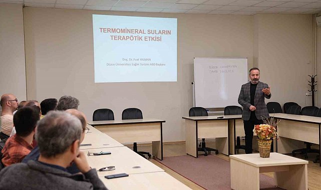 Etkinliğe davetli konuşmacı olarak katılan Düzce Üniversitesi İşletme Fakültesi Sağlık Yönetimi Bölümü Öğretim Üyesi Doç. Dr. Fuat Yalman, termomineral suların tedavi edici etkilerine dair kapsamlı bir sunum yaptı. Termal ve termomineral sular arasındaki farkları anlatan Yalman, bu suların uygulama yöntemleri ve etki mekanizmalarını detaylandırdı. Termal suların, kaldırma kuvveti, viskozite, termik ve kimyasal etkiler, penetrasyon ve flüsyon gibi etki mekanizmaları olduğunu söyleyen Yalman, termomineral suların kimyasal özelliklerine de değindi.