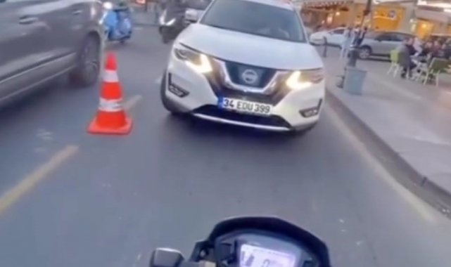 Motosikletli, "Git geri, plakan çıkacak, ceza gelecek. Hadi diye geliyorsun, öyle bir şey yok. Duba var, çekilmiyorum. Geri gidip oradan döneceksin" diyerek sürücüye tepki gösterdi. Otomobil sürücüsü ise aracından inerek motosikletlinin üzerine yürüdü ve "Bilmiyor olabilirim, buradan gelmeyeceksin. Herkes oradan geliyor" şeklinde konuştu.