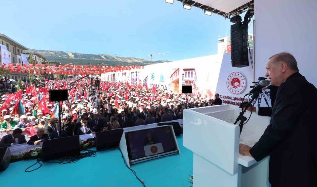 Erdoğan şuana kadar deprem bölgesinde 2 trilyonu aşan yatırım yaptıklarını ifade ederek, "Şimdiye kadar deprem bölgemizde 2 trilyon lirayı aşan yatırım yaptık. Asrın felaketi, tamamen ortadan kalksın diye 2025 bütçemizde 584 milyar liralık kaynak ayırdık. Yıl sonunda tüm şehirlerimizi yeniden ayağa kaldırmayı, geride yarım kalan tek bir hikaye bırakmamayı hedefliyoruz Muhalefet anlamasa da yaşadığımız süreç milli mücadele ile eş değerdir. Ve biz Allah'ın izniyle bu mücadeleyi alnımızın akıyla veriyoruz. Ne diyorlardı? Hükümet bu enkazın altında kalkamaz. Bu muhterislere rağmen, azimle, sabırla, kararlılıkla çalışıyoruz. Her zaman söylüyorum, herkesin denizi ufku kadardır. Her seçim döneminde bol keseden adım tutan, Şimdi deprem bölgesinin yolunu dahi hatırlayamayanların ufku da ancak sandıkları kadardır. İşleri bitince maalesef millet akıllarına da iyi gelmiyor. Koltuk kavgasından, rant mücadelesinden, Başlarını bile kaldıramıyorlar. Gerçekten acınacak haldeler. Kardeşlerim bizim pusulamız hiçbir zaman muhalefet olmadı. Biz yirmi üç yıldır olduğu gibi yine sadece işimize bakıyoruz. Onlar umutsuzluk yayacak. Biz afetlerde kardeşimizin umudu, yoldaşı, kader arkadaşı olacağız. Onlar yapamazsınız diyecek. Biz şehirlerimizi hep birlikte daha güçlü biçimde ayağa kaldıracağız. Onlar engel çıkartacak biz ya bir yol bulup ya bir yol açıp engellerin üstesinden geleceğiz. Onlar didişirken, kavga ederken boş beleş işlerle günlerini geçirirken biz Kahramanmaraş'la birlikte tüm Türkiye'ye aşkla hizmet edeceğiz" şeklinde konuştu.