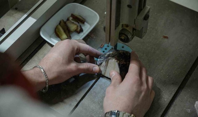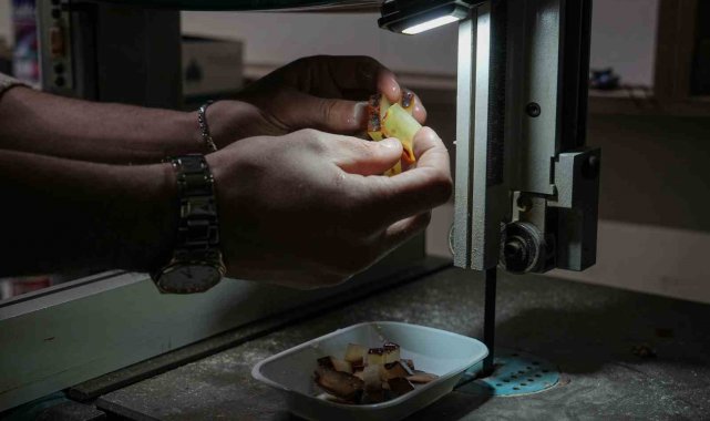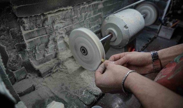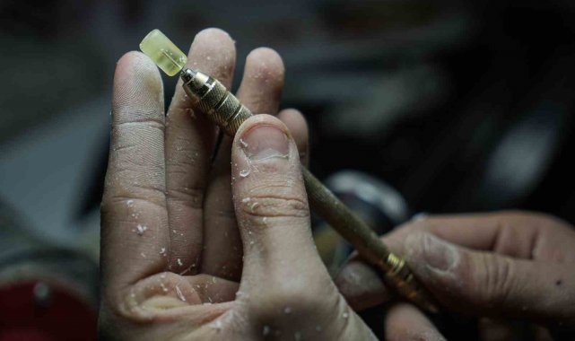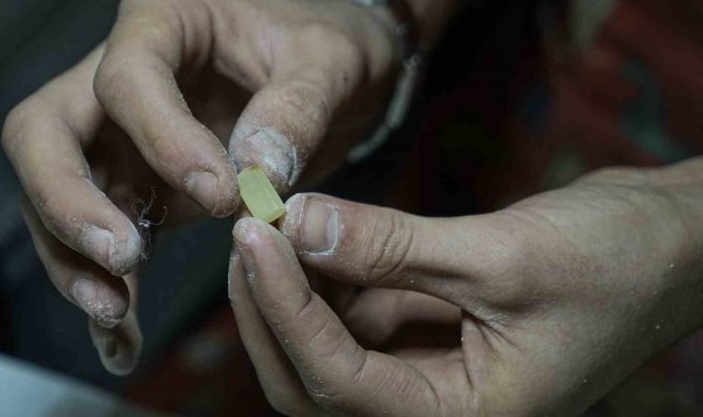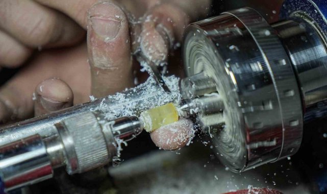 Yapım aşamasını sıralayan Cengiz, "Kaya halinde bizim elimize ulaşıyor. Biz bunu işlemeden önce su içerisinde bekletiyoruz. Çünkü havayla temas ettiği zaman sertleşiyor ve yapım aşamasında kırılıp çatlamalara maruz kalıyor. Parçaları küp küp hale getirdikten sonra taslak aşamasına geçiyoruz. Taslak aşamasında taneleri silindir şeklinde yuvarlıyoruz. Delim aşamasından sonra tanelere form veriyoruz. Daha sonra ise zımpara ve cila işlemine geçiyoruz. Zımparadan sonra daha parlak bir görüntü oluşması ve elde kullanırken rahat bir çekim sağlaması için cila atıyoruz. Cilanın ardında dizimini bitirip müşteriye teslim ediyoruz" ifadelerini kullandı.