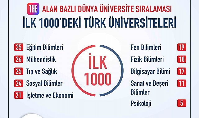 THE'nin Eğitim Bilimleri Alan Sıralamasında ilk 100'de 1, ilk 500'de 6, ilk binde'de 35 Türk üniversitesi yer aldı. Eğitim bilimleri alanında 35, mühendislikte 26, tıp ve sağlıkta 25, sosyal bilimlerde 24, işletme ve ekonomide 21, fen bilimlerinde 19, fizik bilimlerinde 18, bilgisayar bilimlerinde 17, sanat ve beşerî bilimlerde 11, psikolojide 5 Türk üniversitesi alan sıralamalarında dünyada ilk bine girmeyi başardı.