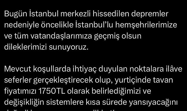Mevcut şartlarda ihtiyaç duyulan noktalara ilâve seferler gerçekleştirecek olup, yurtiçinde tavan fiyatımızı bin 750 TL olarak belirlediğimizi ve değişikliğin sistemlere kısa sürede yansıyacağını değerli kamuoyumuzun dikkatine sunarız" dedi.