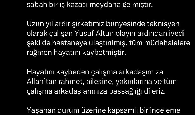 Konuyla ilgili açıklama yapan THY İletişim Başkanı Yahya Üstün, "İştirak şirketimiz THY Teknik A.Ş.'nin Sabiha Gökçen Yerleşkesi İniş Takımları Atölyesinde bu sabah bir iş kazası meydana gelmiştir. Uzun yıllardır şirketimiz bünyesinde teknisyen olarak çalışan Yusuf Altun olayın ardından ivedi şekilde hastaneye ulaştırılmış, tüm müdahalelere rağmen hayatını kaybetmiştir. Hayatını kaybeden çalışma arkadaşımıza Allah'tan rahmet, ailesine, yakınlarına ve tüm çalışma arkadaşlarımıza başsağlığı dileriz. Yaşanan durum üzerine kapsamlı bir inceleme başlatılmıştır. Kamuoyunun bilgisine sunarız" ifadelerini kullandı.