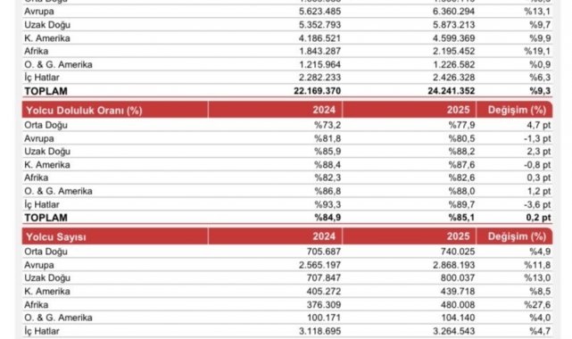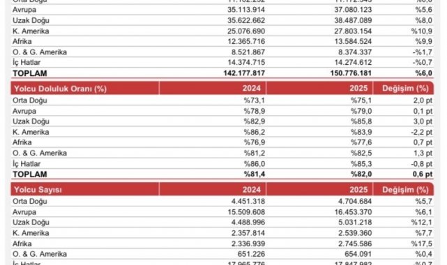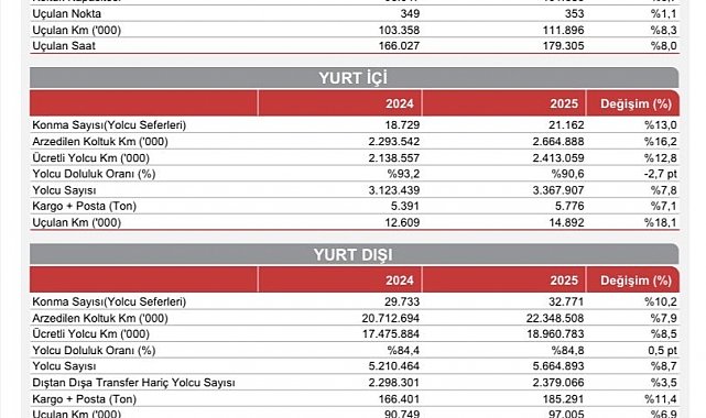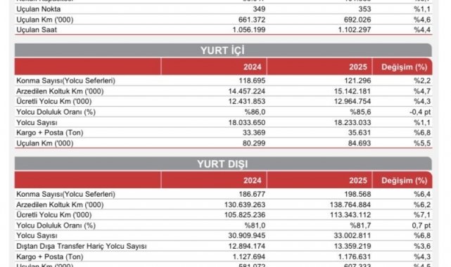 Şirketin geçen yıl Temmuz ayında 8,3 milyon olan toplam yolcu sayısı, bu yıl aynı dönemde yüzde 8,4 artışla 9 milyona ulaştı. Dıştan dışa transfer yolcu sayısı ise Temmuz 2025'te, geçen yılın aynı ayına göre yüzde 12,8 artarak 3,3 milyon olarak kayıtlara geçti. Yolcu doluluk oranı Temmuz ayında 0,2 puanlık artışla yüzde 85,4'e yükselirken; yurt dışı uçuşlarda doluluk oranı yüzde 84,8, yurt içi uçuşlarda ise yüzde 90,6 olarak gerçekleşti. Geçen yıl Temmuz ayında 23 milyar olan toplam arz edilen koltuk kilometresi (AKK), bu yılın aynı döneminde yüzde 8,7 artarak 25 milyara çıktı. Aynı dönemde taşınan kargo ve posta miktarı ise yüzde 11,2 artış göstererek 191,1 bin ton seviyesine ulaştı.