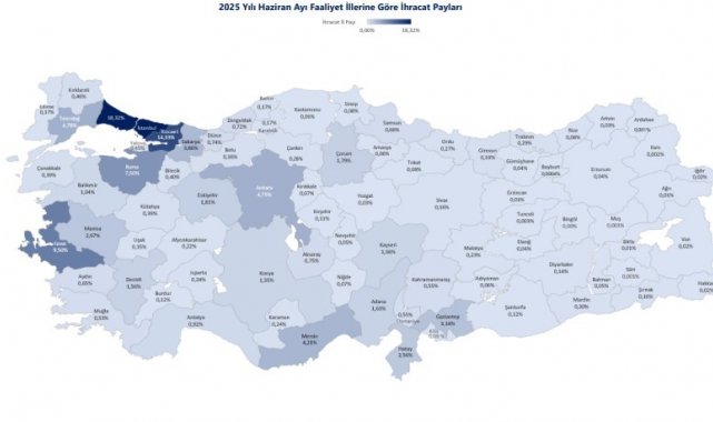 Haziran ayında faaliyet illeri bazında ihracata bakıldığında, İstanbul 3 milyar 762 milyon dolar ile birinci sırada, Kocaeli 2 milyar 942 milyon dolar ile ikinci sırada, İzmir 1 milyar 950 milyon dolar ile üçüncü sırada, Bursa 1 milyar 541 milyon dolar ile dördüncü sırada Tekirdağ ise 981 milyon dolar ile beşinci sırada yer aldı.