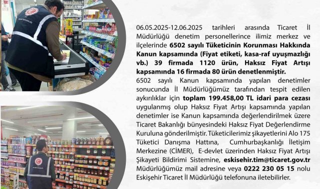 Ticaret İl Müdürlüğü'nün haftalık denetimleri sürüyor. Bu çerçevede Eskişehir Valiliği tarafından paylaşılan bilgilere göre; 6-12 Haziran 2025 tarihleri arasında Ticaret İl Müdürlüğü denetim personelleri tarafından il merkezinde ve ilçelerde çalışma yapıldı. Ekiplerce, 6502 sayılı Tüketicinin Korunması Hakkında Kanun kapsamında, fiyat etiketi, kasa-raf uyumsuzluğu ve benzeri şeyler hakkında 39 firmada bin 120 ürün kontrol edildi. Haksız fiyat artışıyla ilgili ise 16 firmada 80 ürün denetlendi. 6502 sayılı Kanun ile ilgili tespit edilen aykırılıklar için toplam 199 bin 458 TL idari para cezası uygulandı. Haksız fiyat artışıyla ilgili yapılan denetimlerin raporları ise, kanun kapsamında değerlendirilmek üzere Ticaret Bakanlığı bünyesindeki Haksız Fiyat Değerlendirme Kurulu'na gönderildi.