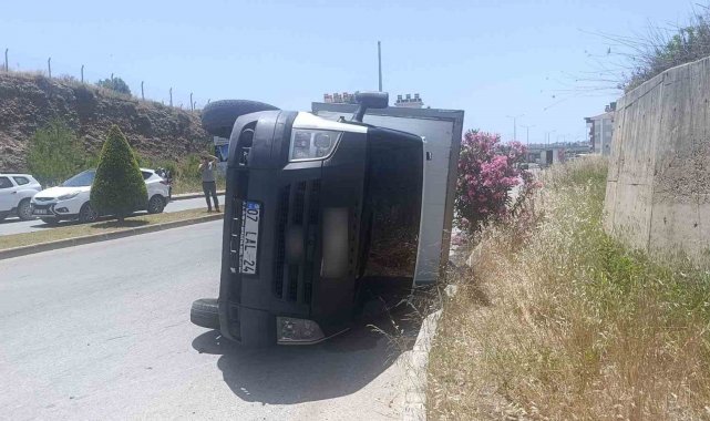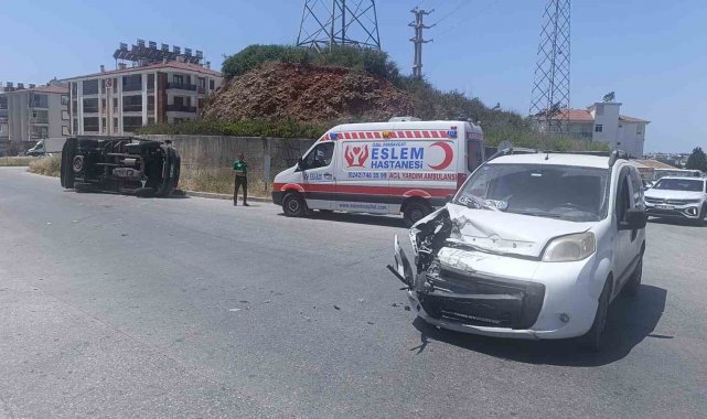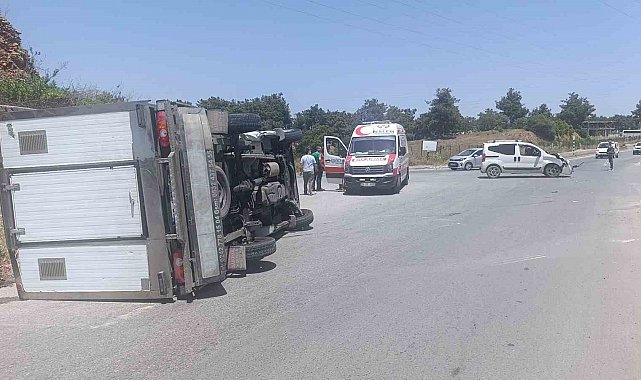 Manavgat ilçesinde meydana gelen trafik kazasında hafif ticari aracın yandan çarptığı kamyonet devrildi.