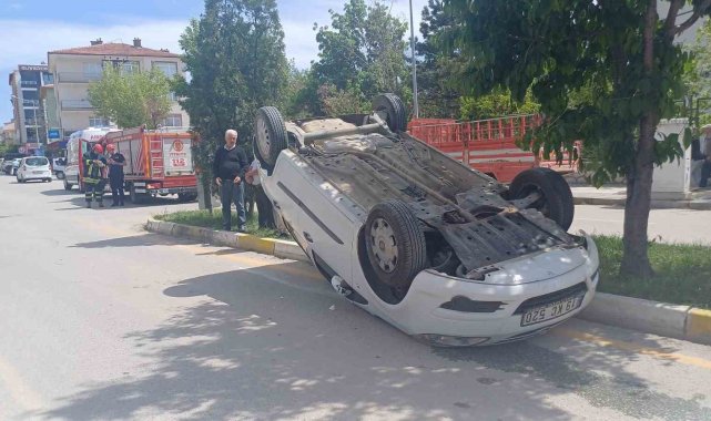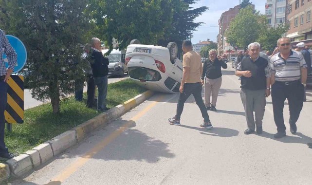 Çorum'da hafif ticari araçla çarpışan otomobil, kaldırıma çıkarak takla attı. Kazada sürücüler yara almadan kurtuldu.