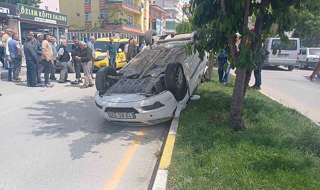 Ticari teksiyle çarpışıp takla atan otomobilin sürücüsü yara almadan kurtuldu