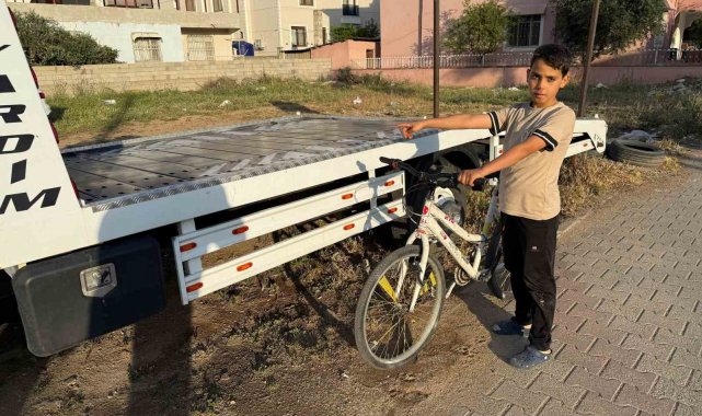 Hatay'da Tiktok'da gördüğü video üzerine heveslenerek çekici üzerinde bisiklet süren çocuğun yere düşerek yaralandığı anlar kameraya yansıdı.