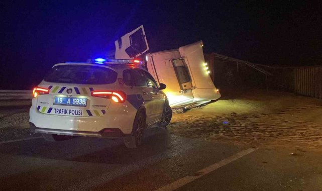 Çorum'da yem yüklü tırın devrilmesi neticesinde meydana gelen kazada sürücü yaralandı. Yola saçılan hayvan yemi sebebiyle kapanan yolda yaklaşık 2 kilometre uzunluğunda araç kuyruğu oluştu.