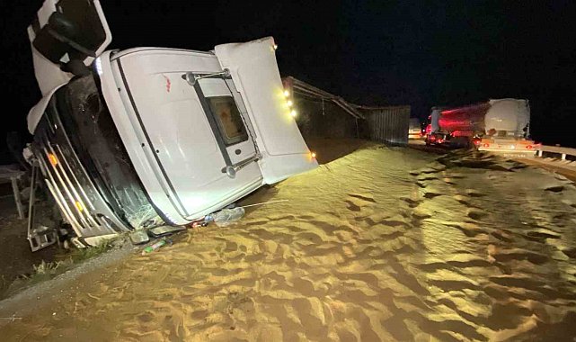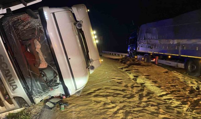 Tır devrildi, saçılan hayvan yemi yolu kapattı