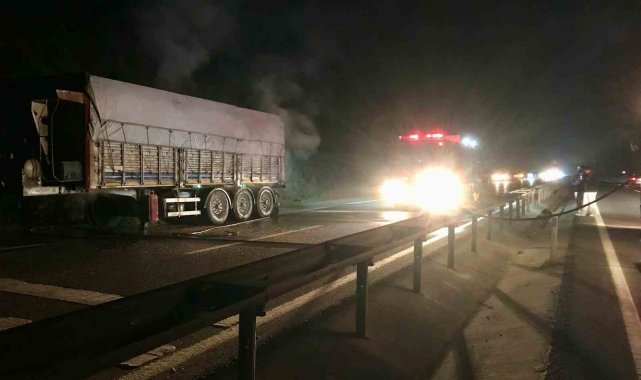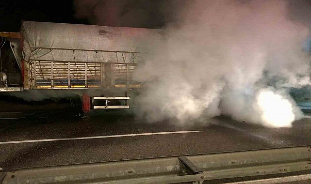 Tırın alev alev yanan lastikleri itfaiye ekiplerince söndürüldü