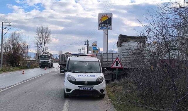 Afyonkarahisar'da meydana gelen trafik kazasında kontrolden çıkan tır bir başka tırın dorsesine çarparken, kaza esnasında yolun boş olması yaşanabilecek bir facianın önüne geçti.