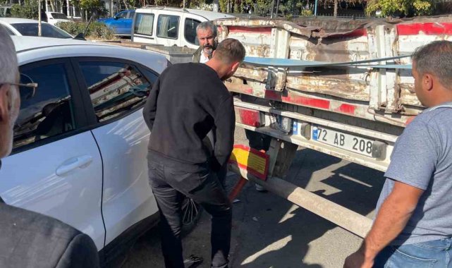 Tırın dorsesi otomobilin teker bölümüne takıldı