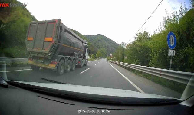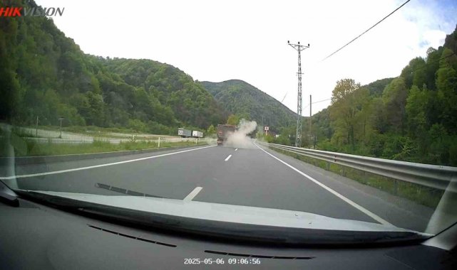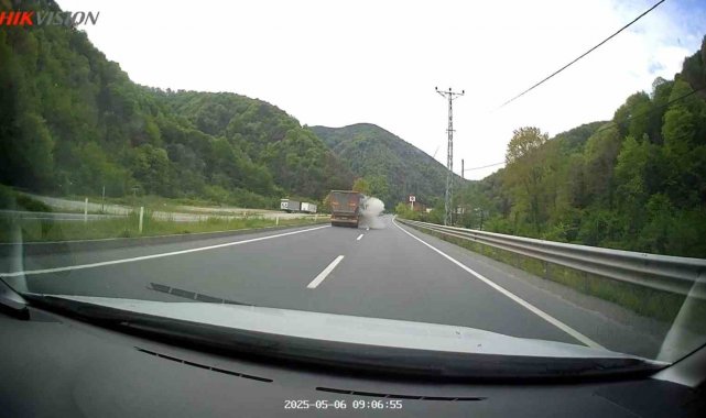 Zonguldak'ın Kozlu ilçesine bağlı Ilıksu mevkisinde, İstanbul istikametine seyir halinde olan bir tırın lastiği aniden patladı. Patlama anı, aynı güzergahtan geçen başka bir aracın araç kamerasına saniye saniye yansıdı.