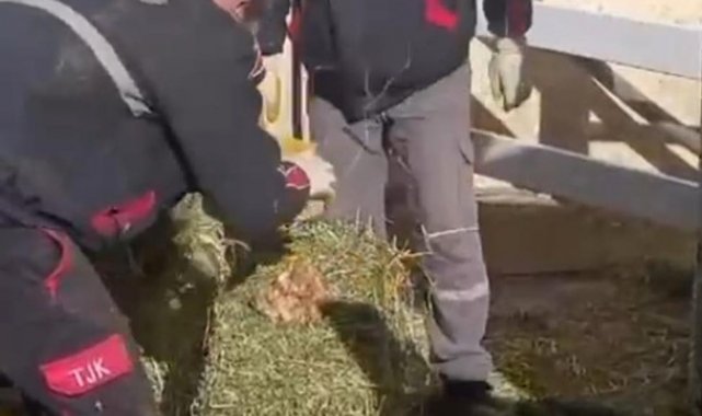 Yonca balyalarına taş yerleştirilirken görevlilerin rahatlıkları da dikkatlerden kaçmadı.