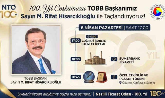 Türkiye Odalar ve Borsalar Birliği (TOBB) ve Dünya Odalar Federasyonu Başkanı M. Rifat Hisarcıklıoğlu, 6 Nisan 2026 Pazartesi günü Nazilli Ticaret Odası'nı ziyaret edecek. Başkan Hisarcıklıoğlu'nun Nazilli Ticaret Odası'nı ziyaret ederek odanın 100. kuruluş yılı etkinliğine katılacağını ifade eden Nazilli Ticaret Odası Yönetim Kurulu Başkanı Nuri Arslan; "100. yıl coşkumuzu TOBB Başkanımız M. Rifat Hisarcıklıoğlu ile taçlandırıyoruz. Nazilli Ticaret Odası olarak kuruluşumuzun 100. yılını kutlamanın gururunu yaşıyoruz. Bu tarihi dönüm noktasında, TOBB Başkanımız M. Rifat Hisarcıklıoğlu, 6 Nisan Pazartesi günü odamızı ziyaret ederek bizleri onurlandıracak. TOBB Başkanımızı ilçemizde ağırlayacak olmaktan dolayı çok mutluyuz. 100. yılımıza özel hazırladığımız bu anlamlı program, saat 17.00'de yöremizin eşsiz lezzetleri olan coğrafi işaretli ürünlerimizin keşkek, pide, Bozdoğan sucuğu ve Sultanhisar çileğinin ikramıyla başlayacak. Ardından saat 18.00'de şehrimizin önemli miraslarından Sümerbank'a gerçekleştireceğimiz ziyaretle devam edecek olan programımızı, saat 18.45'te odamız konferans salonunda düzenleyeceğimiz özel etkinlik ve plaket töreni ile taçlandıracağız. Üyelerimizden aldığımız güçle 100 yıldır olduğu gibi bugün de Nazilli'miz için çalışmaya ve üretmeye devam edeceğiz. Birlikte daha nice asırlara" dedi.