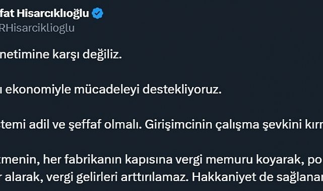 Sosyal medya hesabından vergi sistemine ilişkin açıklamalarda bulunan Hisarcıklıoğlu, "Vergi denetimine karşı değiliz. Kayıtdışı ekonomiyle mücadeleyi destekliyoruz. Vergi sistemi adil ve şeffaf olmalı. Girişimcinin çalışma şevkini kırmamalı. Her işletmenin, her fabrikanın kapısına vergi memuru koyarak, polisiye tedbirler alarak, vergi gelirleri arttırılamaz. Hakkaniyet de sağlanamaz" ifadelerini kullandı.
