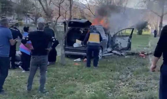 Tokat'ın Turhal ilçesinde ağaca çarpan cipin alev aldığı kazada 1 kişi öldü, 2 kişi yaralandı.