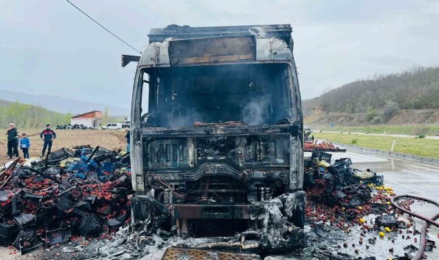 Tokat'ta seyir halindeki çilek yüklü bir kamyon yanarak kullanılamaz hale geldi.