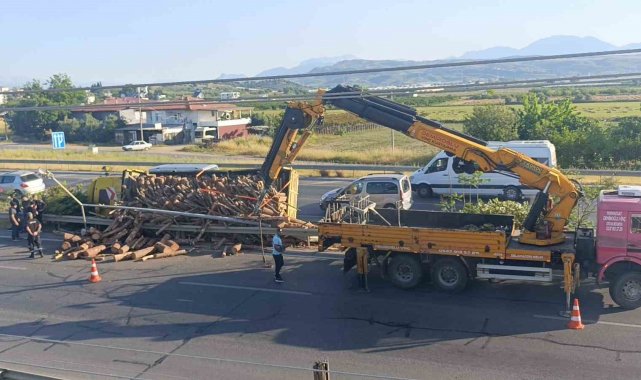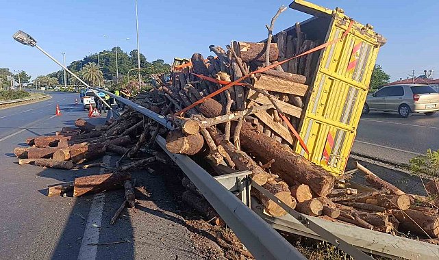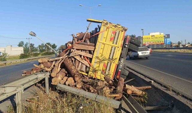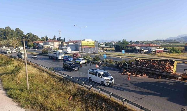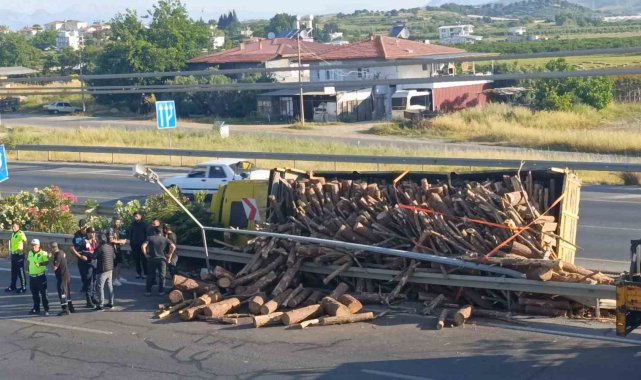 Antalya'nın Manavgat ilçesinde tomruk yüklü kamyonun bariyerleri aşıp refüje devrilmesi sonucu meydana gelen kazada şans eseri yaralanan olmadı.