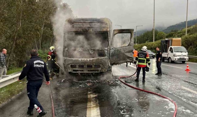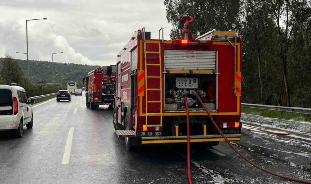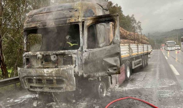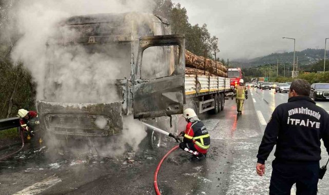 Aydın-İzmir Otoyolu üzerinde tomruk yüklü tır, alev topuna dönerken, yangın, itfaiyenin müdahalesiyle söndürüldü, tır ise kullanılamaz hale geldi.