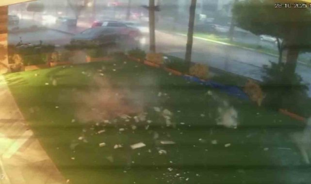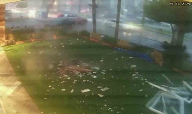 Antalya'da dün akşam saatlerinde yaşanan fırtınaya dayanamayarak yola uçan tonlarca ağırlığındaki çatının düşme anı güvenlik kamerasına yansıdı
