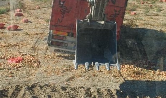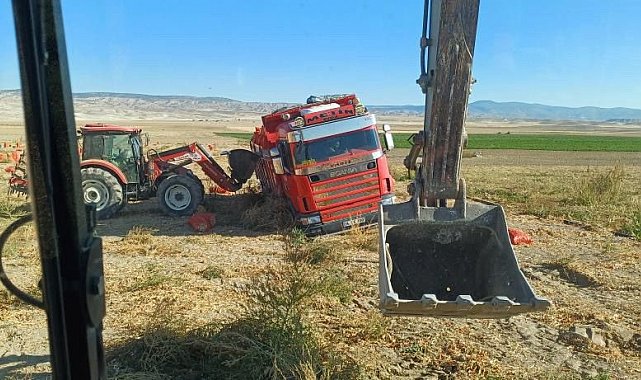 Tonlarca soğan taşıyan tır ıslak arazide toprağa gömüldü