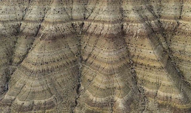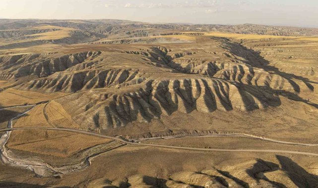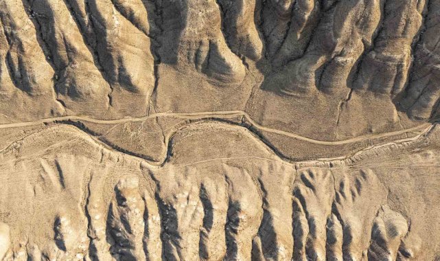 Çankırı'nın Kızılırmak ilçesindeki plato ve dağlık alanlarda bulunan, kireçtaşı, jips, marn ile killi topraklardan oluşan rengarenk tepeler, havadan görüntülendi. Geniş bir coğrafyaya yayılan ve doğal yollarla oluşan jeolojik yapı, adeta doğanın renkli bir tuvali gibi manzara sunuyor. Doğal aşınma süreçleri ve farklı toprak katmanlarının birleşimiyle ortaya çıkan benzersiz tepeler, fotoğraf tutkunları için de cazibe merkezi haline geliyor. Özellikle gün doğumu ve batımında oluşan gölgelerle birlikte tepelerin kıvrımları ve renk geçişleri, kartpostallık kareler oluşturuyor.