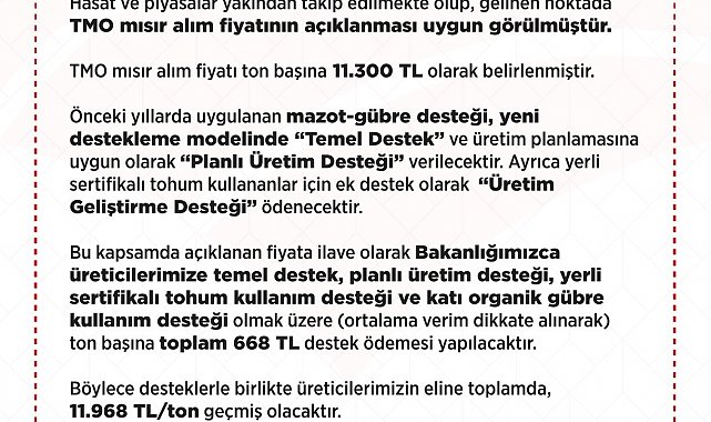 "Ülkemizde mısır hasadı Ağustos ayı başında Adana ve Hatay'da lokal olarak başlamıştır. Ülke genelinde hasat oranı yaklaşık yüzde 5 seviyelerindedir. Hasat ve piyasalar yakından takip edilmekte olup, gelinen noktada Toprak Mahsulleri Ofisi mısır alım fiyatının açıklanması uygun görülmüştür. Toprak Mahsulleri Ofisi mısır alım fiyatı ton başına 11 bin 300 lira olarak belirlenmiştir. Önceki yıllarda uygulanan mazot-gübre desteği, yeni destekleme modelinde 'Temel Destek' ve üretim planlamasına uygun olarak 'Planlı Üretim Desteği' verilecektir. Ayrıca yerli sertifikalı tohum kullananlar için ek destek olarak 'Üretim Geliştirme Desteği' ödenecektir. Bu kapsamda açıklanan fiyata ilave olarak Bakanlığımızca üreticilerimize temel destek, planlı üretim desteği, yerli sertifikalı tohum kullanım desteği ve katı organik gübre kullanım desteği olmak üzere (ortalama verim dikkate alınarak) ton başına toplam 668 lira destek ödemesi yapılacaktır. Böylece desteklerle birlikte üreticilerimizin eline toplamda, 11 bin 968 lira/ton geçmiş olacaktır. Toprak Mahsulleri Ofisi ürün bedeli ödemeleri, ürün teslimatını müteakip 30 gün içerisinde üreticilerin banka hesaplarına yapılacaktır. Tüm üreticilerimize hayırlı ve bereketli bir hasat sezonu diliyoruz."