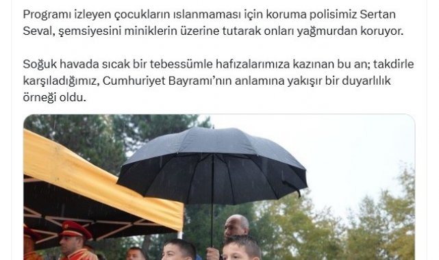 DÜZCE(İHA) – Düzce'de Cumhuriyet Bayramı çelenk sunma töreni sırasında yağan yağmurda vali koruması Polis Memuru Sertan Seval şemsiyesini törene katılan miniklerin üzerine tutarak yağmurdan korudu. Vali Aslan fotoğrafı sosyal medya hesabında paylaşarak şu notu düştü; "Türk polisi vicdan, merhamet ve adalet sahibidir."