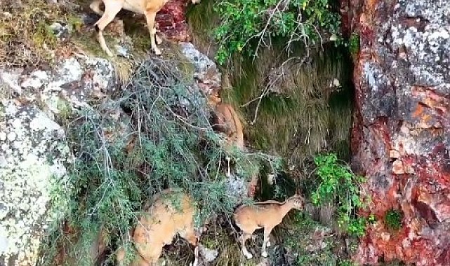Torul Kalesi'nin sarp kayalıklarındaki yaban keçileri dron kamerasına yansıdı.