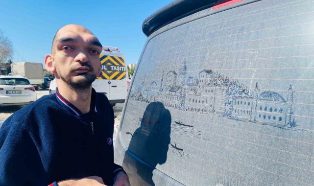 Antalya'nın Aksu ilçesinde yaşayan, 4 yaşından bu yana resim yapan işitme engelli ressam Alper Kocabıyık, alışılmışın dışında bir tuval kullanıyor. Kocabıyık, tozlu araçların camlarını adeta sanat eserine dönüştürüyor.