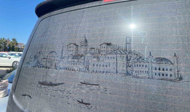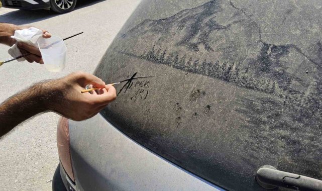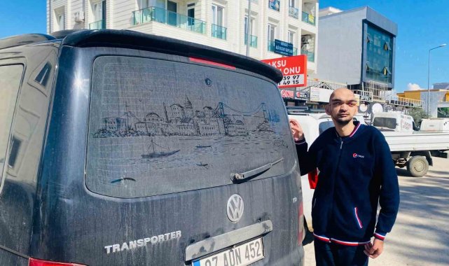 Tozlu araç görünce dayanamıyor, camları sanat eserine dönüştürüyor