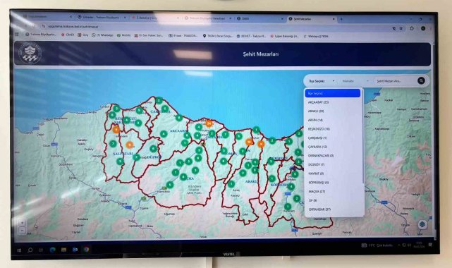 Trabzon Büyükşehir Belediyesi tarafından il genelindeki şehit mezarlarının konumlarını içeren dijital harita hizmeti hayata geçirildi. Uygulama ile vatandaşlar, şehit kabirlerine ait bilgilere çevrim içi olarak kolaylıkla ulaşabilecek. Belediyenin resmi internet sitesi üzerinden erişilebilen sistemde, ilk etapta terör şehitlerinin mezarlarına ilişkin fotoğraflar, sokak görünümü ve yol tarifi gibi detaylar yer alıyor. Kullanıcılar, harita üzerinden konum seçerek kabirlere en kısa ve en uygun güzergahı görüntüleyebiliyor.