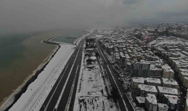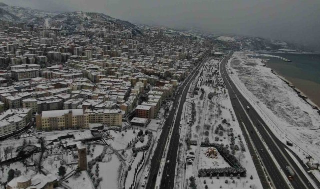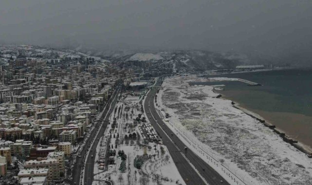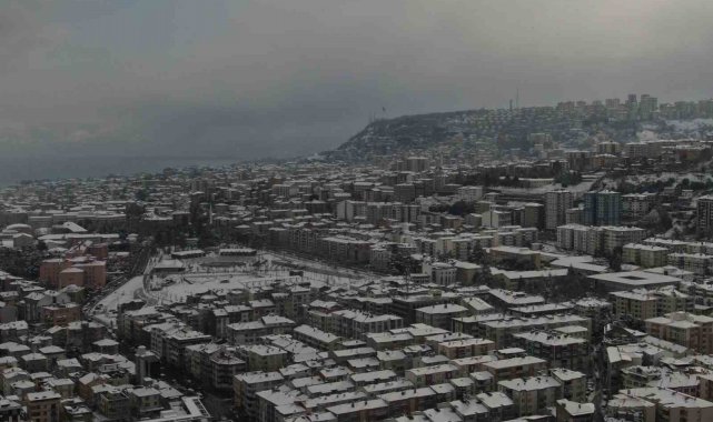 Trabzon'da etkili olan kar yağışıyla kent merkezi beyaza büründü. Görsel şölenin oluştuğu şehir havadan görüntülenirken, kardan kapanan 214 mahalle yolunun açılması için çalışmalar sürüyor.