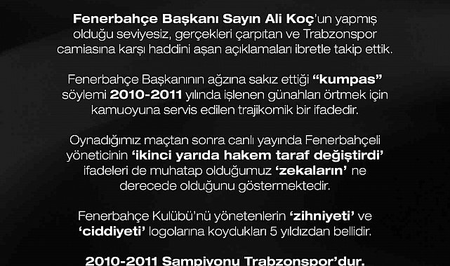 2010-2011 sezonu şampiyonunun Trabzonspor olduğunu vurgulayan Başkan Doğan, "Kirlettiğiniz şampiyonluk kupamız orada oldukça da yüzünüz gülmeyecektir" sözleriyle açıklamasını noktaladı.