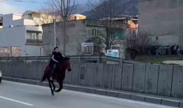 Bursa'da 15-16 yaşlarında bir genç, bindiği atla anayolda trafiğe çıkıp dört nala koştu. O anlar kameraya yansırken, genci görenler dönüp bir daha baktı.