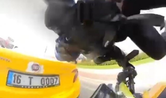 Bursa'da seyir halindeki motosiklet sürücüsü, önünde duran taksiyi görmeyip çarptı. O anlar motosiklet sürücüsünün aksiyon kamerasına yansıdı.