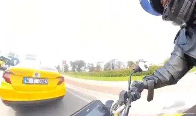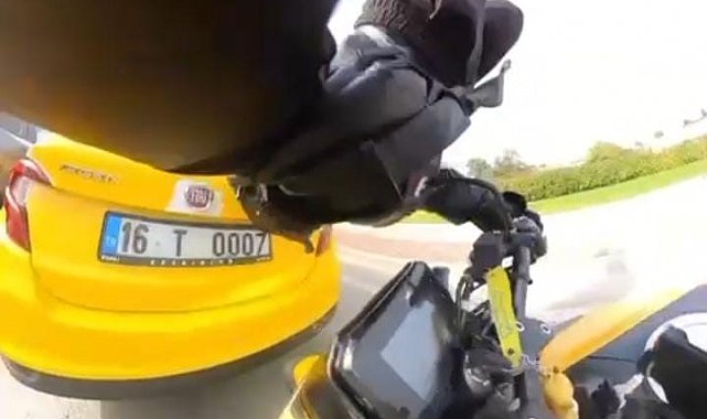 Kaza dün öğle saatlerinde Nilüfer ilçesinde meydana geldi. Trafikte seyreden motosiklet sürücüsü, etrafına baktığı sırada trafik durdu. Önünde duran ticari taksiyi fark etmeyen motosiklet sürücüsü taksiye arkadan çarparak devrildi. O anlar motosiklet sürücüsünün aksiyon kamerasına yansıdı.