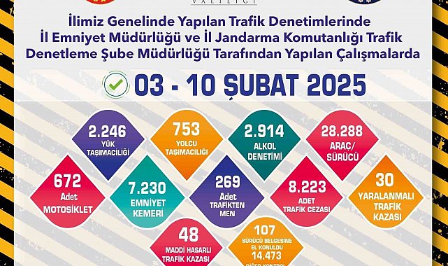 Edinilen bilgiye göre; İl Emniyet Müdürlüğü ve İl Jandarma Komutanlığı'na bağlı ekipler tarafından 03-10 Şubat tarihleri arasında trafik denetimi gerçekleştirildi. Denetimlerde, 28 bin 288 araç sürücüsü kontrol edildi. Yapılan denetimler sonucunda 8 bin 223 adet trafik cezası yazılırken, 269 araç trafikten men edildi. Ayrıca 107 sürünün ehliyetine el konuldu.