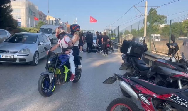 Trafik durunca, aradan ilerleyen motosikletler birbirine girdi