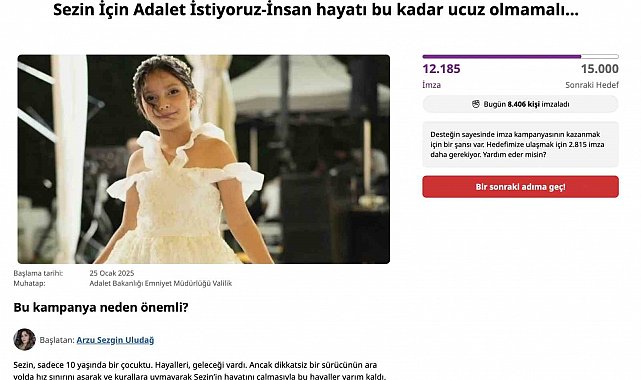Samsun'un Çarşamba ilçesinde trafik kazasında hayatını kaybeden 10 yaşındaki Sezin Sezgin'in ailesinin başlattığı imza kampanyasına destek yağdı. "Sürücünün tutuklu yargılanması ve en ağır cezayı alması" talebine 12 binin üzerinde kişi imzalarıyla destek verdi.