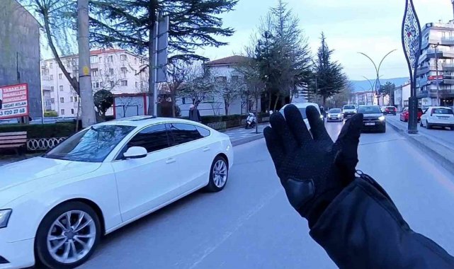 Bolu'da aniden yola çıkarak motosikletliyi tehlikeye atan ve ardından "Hatalı sollama yaptın" diyerek polise şikayette bulunan otomobil sürücüsünün haksız olduğu, kask kamerası görüntüleriyle ortaya çıktı. Görüntüleri izleyen sürücü hatasını kabul etmek zorunda kaldı.
